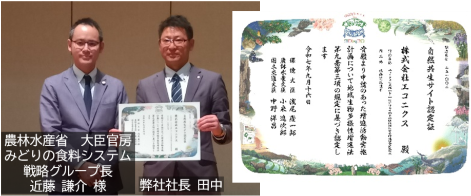 その後、2025年4月に自然共生サイトを法制化した 「地域生物多様性増進法」 が施行され、この度、弊社のエコ森林を含む201か所が本法に基づく初めての自然共生サイトとして認定を受け、2025年9月30日に「令和7年度 自然共生サイト認定式」が行われました[1] 。