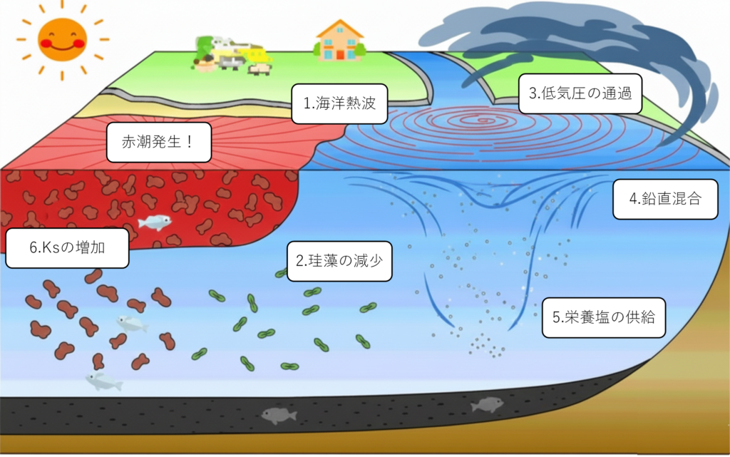しかし、2021年には非常に強い海洋熱波が発生し、競合相手である珪藻類の増殖が抑制・へい死したことで、Ksが増えやすい環境が生まれました。さらに、同時期に多くの低気圧が通過したことにより海水が撹拌され(鉛直混合)、深層から多量の栄養塩が供給されたことで、Ksが一気に増殖したと考えられます6)。